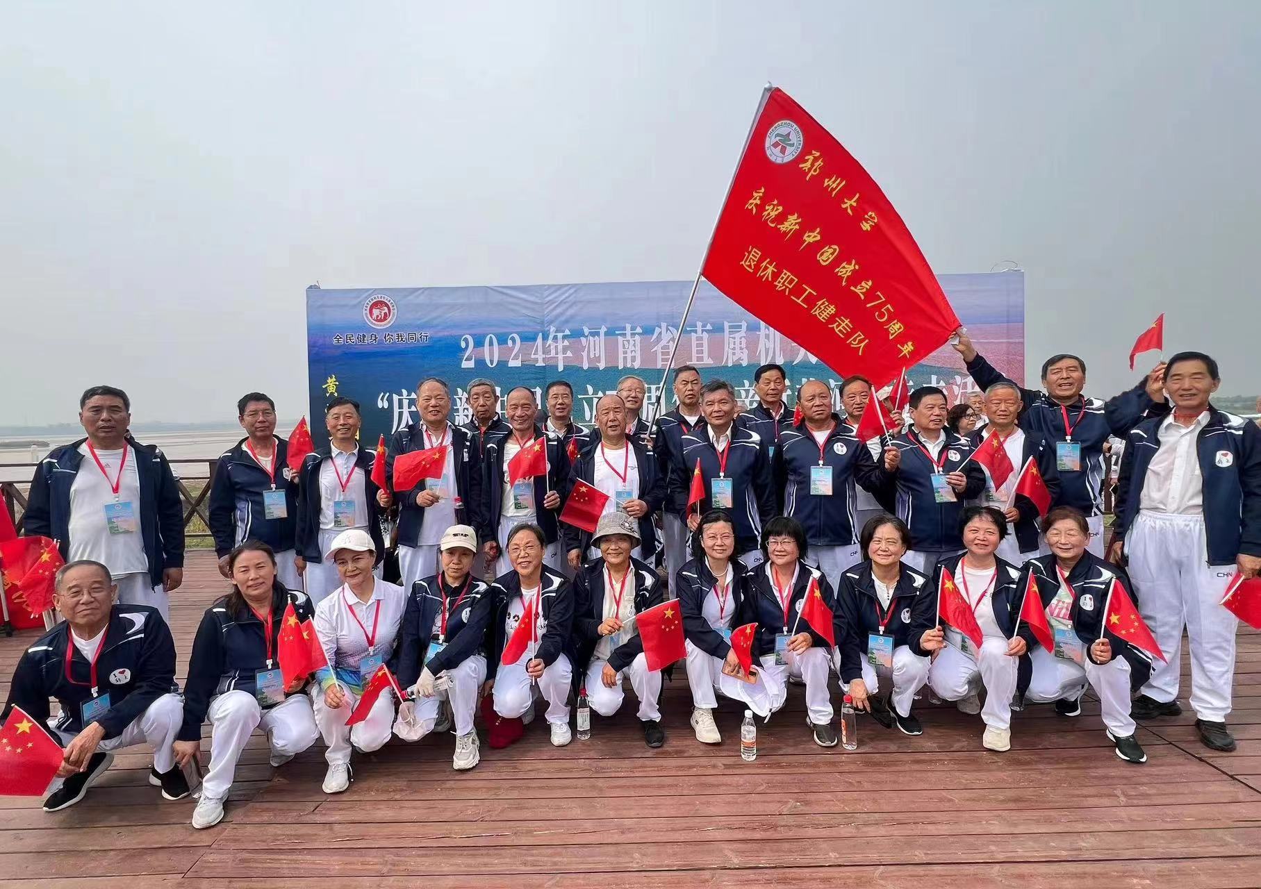 為慶祝中華人民共和國成立75周年,深入貫徹黨的二十大和二十屆三中全會精神,認真落實“做好離退休干部工作”的要求,豐富我校離退休職工精神文化生活,9月26日,學校組織30余位退休教職工代表參加了中共河南省委老干部局、河南省體育局舉辦的2024年省直機關老年人“慶祝新中國成立75周年”親近黃河健步走活動,并榮獲“優秀組織獎”。