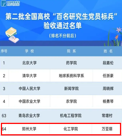化工學(xué)院黨委入選全國黨建工作標桿院系培育創(chuàng)建單位,學(xué)院榮獲2023年度河南省教育系統(tǒng)先進集體,化學(xué)工程與工藝系黨支部入選首批河南省高校樣板黨支部,制藥工程系黨支部和行政黨支部先后獲批河南省高校先進基層黨組織,博士生黨支部入選河南省黨建工作樣板支部,學(xué)生團支部獲評河南省五四紅旗團支部;學(xué)院師生先后榮獲河南省高等學(xué)校優(yōu)秀共產(chǎn)黨員、全國百名研究生黨員標兵、河南省教科文衛(wèi)體系統(tǒng)“工匠人才”、“師帶徒”標兵、“優(yōu)秀教師”、“出彩河南人”最美大學(xué)生、河南省百優(yōu)十佳“魅力團支書”等榮譽稱號。