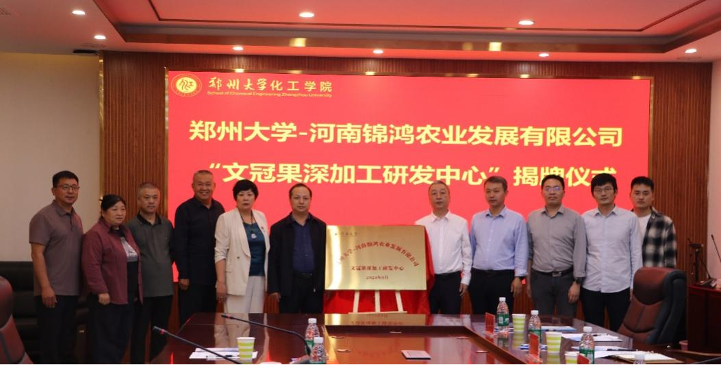 劉春太與鄧奇輝共同為鄭州大學—河南錦鴻農業發展有限公司“文冠果深加工研發中心”揭牌,雙方與會人員圍繞研發中心的發展建設展開深入探討。