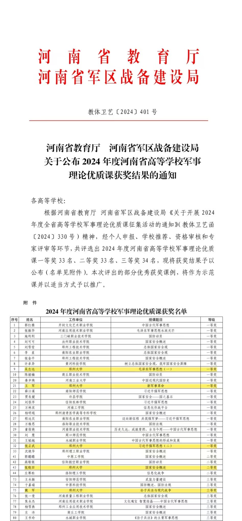 近日,河南省教育廳、河南省軍區戰備建設局聯合公布2024年度河南省高等學校軍事理論優質課評獎結果,鄭州大學在此次優質課教學展示活動中取得優異成績,綜合成績在全省高校中居于首位。人民武裝部軍事理論教研室教師王軍、吳志遠、張正武榮獲一等獎,張曉田榮獲二等獎,戴軍榮獲三等獎。