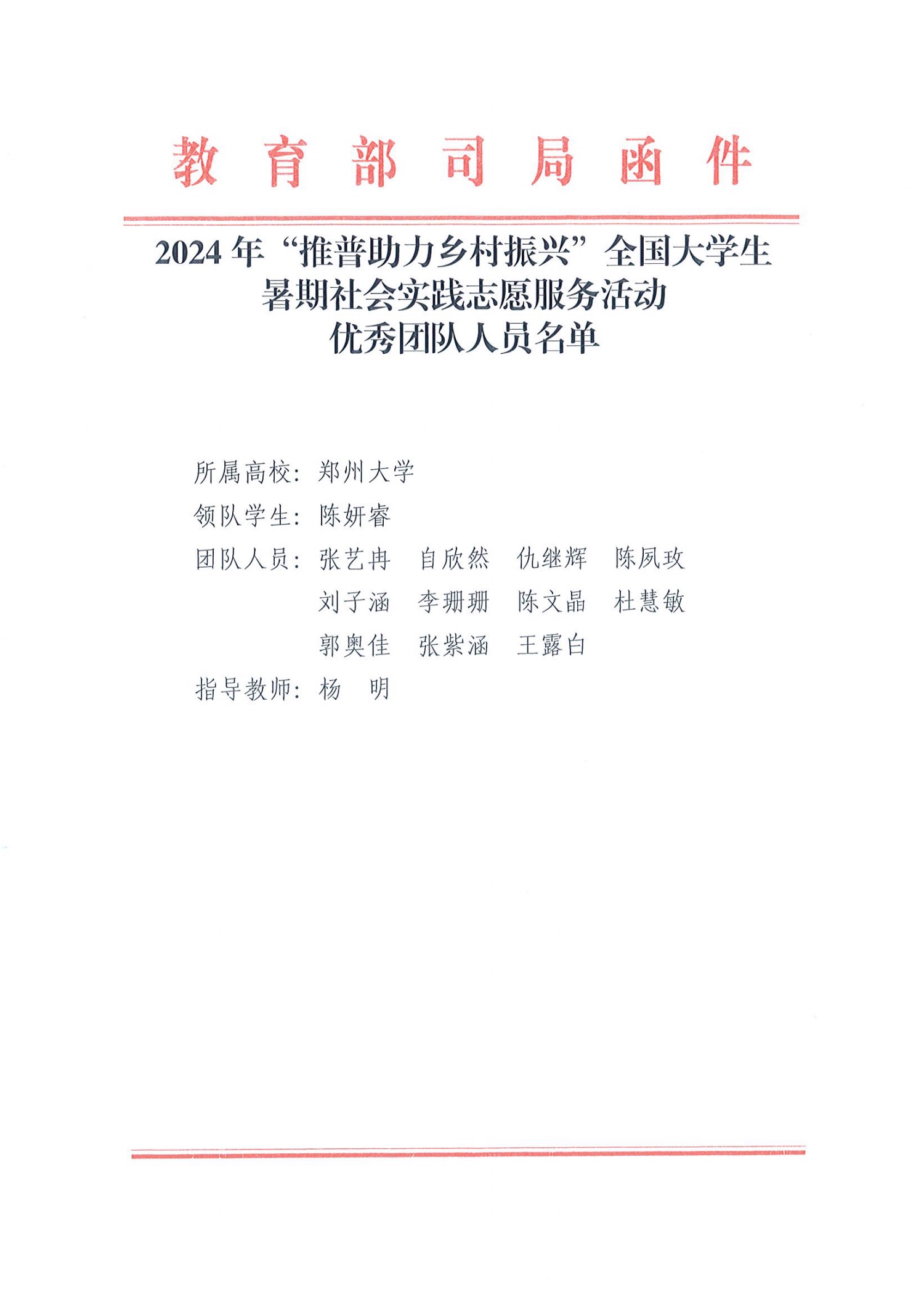 日前,教育部語言文字應(yīng)用管理司和共青團(tuán)中央青年發(fā)展部向鄭州大學(xué)發(fā)來表揚(yáng)信,對鄭州大學(xué)師生在2024年“推普助力鄉(xiāng)村振興”全國大學(xué)生暑期社會實(shí)踐志愿服務(wù)活動所作出的積極貢獻(xiàn)予以表揚(yáng)。這也是鄭州大學(xué)又一次獲教育部和團(tuán)中央來信表揚(yáng)。