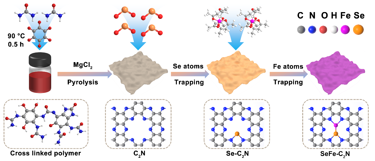 由于具有協同作用,雙原子催化劑(DACs)因其明確定義的活性位點而受到廣泛關注。然而,為了進一步構建明確的雙原子位點并理解其在多步驟催化反應中的協同作用,仍需進行更多的實驗研究和理論分析。為此,研究團隊精確設計了一系列基于硒的不對稱雙原子催化劑,包括異核SeN2–MN2(M=Fe、Mn、Co、Ni、Cu、Mo等)活性位點,以提高氧還原反應(ORR)的效率。在這些設計的基于硒的雙原子催化劑中,硒-鐵雙原子催化劑在堿性ORR中表現出優異的性能,其半波電位達到0.926 V(相對于可逆氫電極)。此外,基于SeN2–FeN2的鋅-空氣電池具有高比容量(764.8 mAh g?1)和最大功率密度(287.2 mW cm?2)。光譜表征和理論計算表明,異核硒原子通過短程調節有效極化了其他金屬原子的電荷分布。此外,與單原子位點Se或Fe相比,SeFe雙原子位點通過*O中間體的共吸附,顯著降低了從*O到*OH的轉換能量障礙。本研究為設計異核雙原子催化劑以提高ORR效率提供了新的視角。