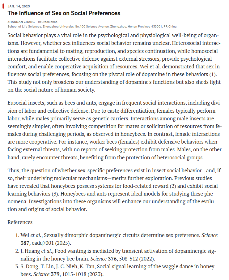 近日,鄭州大學生命科學學院張曌楠博士在國際著名學術期刊《Science》期刊網(wǎng)站的eLetters欄目上在線發(fā)表評述性論文“The Influence of Sex on Social Preferences”(JAN. 14, 2025)。結合近年來蜜蜂神經(jīng)行為學和蜜蜂舞蹈行為學領域的新進展,文章對當期西安交通大學王昌河教授團隊發(fā)表的Science論文“Sexually Dimorphic Dopaminergic Circuits Determine Sex Preference”的研究工作進行了評述,并對社會性昆蟲蜜蜂的性別社交偏好進行了展望。