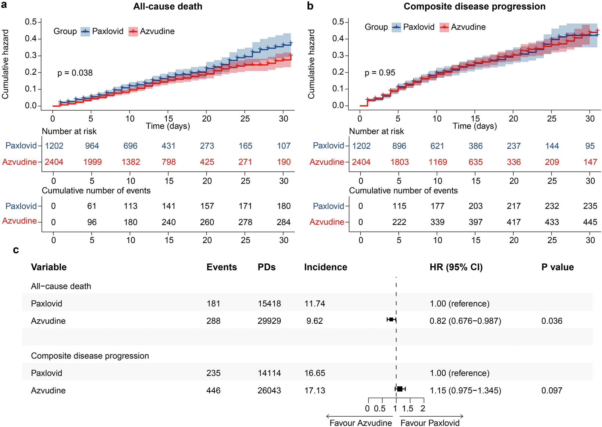 以“Real-world effectiveness and safety of oral azvudine versus nirmatrelvir?ritonavir (Paxlovid) in hospitalized patients with COVID-19: a multicenter, retrospective, cohort study”為題的研究成果發表在Nature旗下頂尖期刊《Signal Transduction and Targeted Therapy》上。文章指出,奈瑪特韋/利托那韋(Paxlovid)作為國際公認的新冠治療藥物,已在多項臨床試驗和真實世界研究中證實療效,尤其是在降低住院率和死亡率方面表現突出。而Paxlovid的高成本、藥物相互作用(如與CYP3A代謝藥物的沖突)以及部分患者的不耐受性,限制了其廣泛應用。阿茲夫定片作為一種價格更低、使用更方便的藥物,與Paxlovid在有效性和安全性上相比如何呢?針對這一問題,余祖江教授團隊開展阿茲夫定片與Paxlovid治療新冠病毒感染的回顧性隊列研究。該研究覆蓋河南、新疆兩省11家醫院,共納入40876例患者。結果顯示:相比于Paxlovid組,阿茲夫定片組全因死亡風險顯著降低18%(P=0.036),復合疾病進展風險無顯著差異,且不良事件較少。亞組分析顯示,阿茲夫定片為惡性腫瘤患者提供了更大的益處,能顯著降低全因死亡風險(HR=0.33)和復合疾病進展風險(HR=0.54)。進一步通過體內外實驗證實阿茲夫定片可以通過調節CD4?T和CD8?T細胞來抑制肝細胞癌生長。鄭州大學余祖江教授、任志剛主任醫師與常俊標院士為通訊作者,王海宇博士生、崔光瑩副主任醫師、程銘高級工程師、新疆醫科大學一附院吐爾干艾力·阿吉教授、洛陽市中心醫院李國濤主任醫師為共同第一作者。
