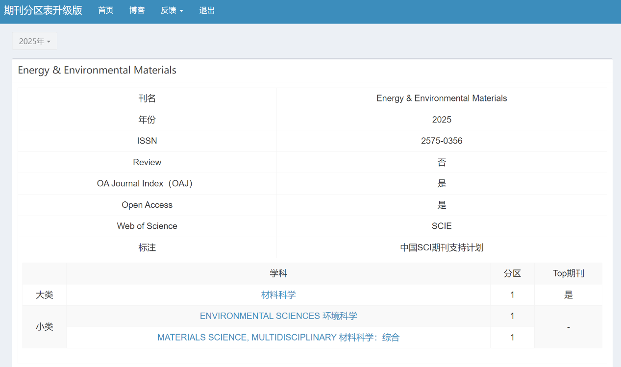 近日,《2025年中國(guó)科學(xué)院文獻(xiàn)情報(bào)中心期刊分區(qū)表》正式發(fā)布,由鄭州大學(xué)主辦的英文學(xué)術(shù)期刊Energy & Environmental Materials(《能源與環(huán)境材料(英文)》,簡(jiǎn)稱EEM)進(jìn)入材料科學(xué)大類:一區(qū)TOP期刊。同時(shí),學(xué)科小類ENVIRONMENTAL SCIENCES(環(huán)境科學(xué))和MATERIALS SCIENCE, MULTIDISCIPLINARY(材料科學(xué):綜合)也雙雙進(jìn)入一區(qū)。