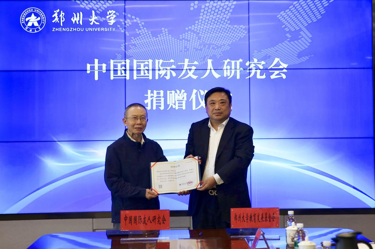 近日,中國國際友人研究會捐贈儀式在學校主校區舉行。中國國際友人研究會執行會長、中國駐坦桑尼亞、塞浦路斯前大使劉昕生,中國國際友人研究會副會長、中國駐剛果、黎巴嫩前大使吳澤獻,中國國際友人研究會副會長、中國駐宋卡前總領事馬鳳春,鄭州大學黨委常委、副校長胡少偉出席儀式。校友總會辦公室、教育發展基金會、國際交流與合作處等單位負責同志參加。