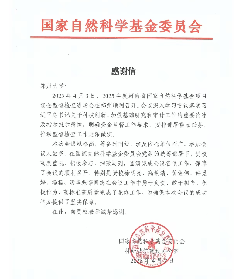近日,鄭州大學(xué)收到國家自然科學(xué)基金委員會科研誠信建設(shè)辦公室發(fā)來的感謝信,感謝鄭州大學(xué)作為承辦單位圓滿完成國家自然科學(xué)基金項(xiàng)目監(jiān)督檢查進(jìn)場會組織工作。