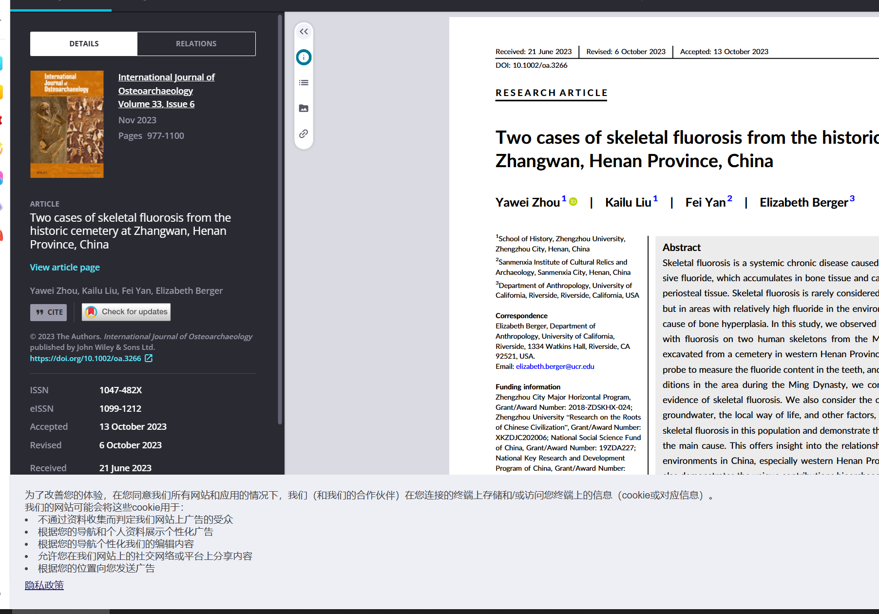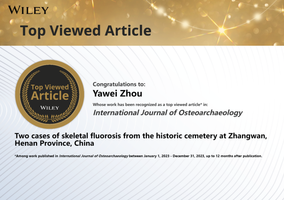 近日,鄭州大學“中華源”考古實驗室團隊在國際期刊《國際骨質考古學雜志》(International Journal of Osteoarchaeology)上發表的科研論文“Two cases of skeletal fluorosis from the historic cemetery at Zhangwan, Henan Province, China”名列Wiley系列雜志2024年最高閱讀量前10%,榮獲Wiley雜志高閱讀量作者獎。該論文由我校“中華源”考古實驗室周亞威教授團隊、美國加州大學河濱分校人類學系Elizabeth Berger博士和三門峽市仰韶文化研究中心燕飛館員合作完成。