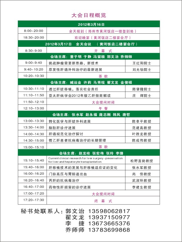 茲定于2012年3月16-17日在鄭州黃河飯店召開,大會邀請到王紅陽院士、劉允怡院士、陳肇隆院士、莊輝院士、陳孝平教授、葉勝龍教授、范建高教授、陳成偉教授、松野直徒教授及國內外知名專家,就肝病基礎與臨床研究的前沿與熱點問題及肝臟外科、肝炎、肝移植、脂肪肝、轉化醫學等專題作精彩演講。