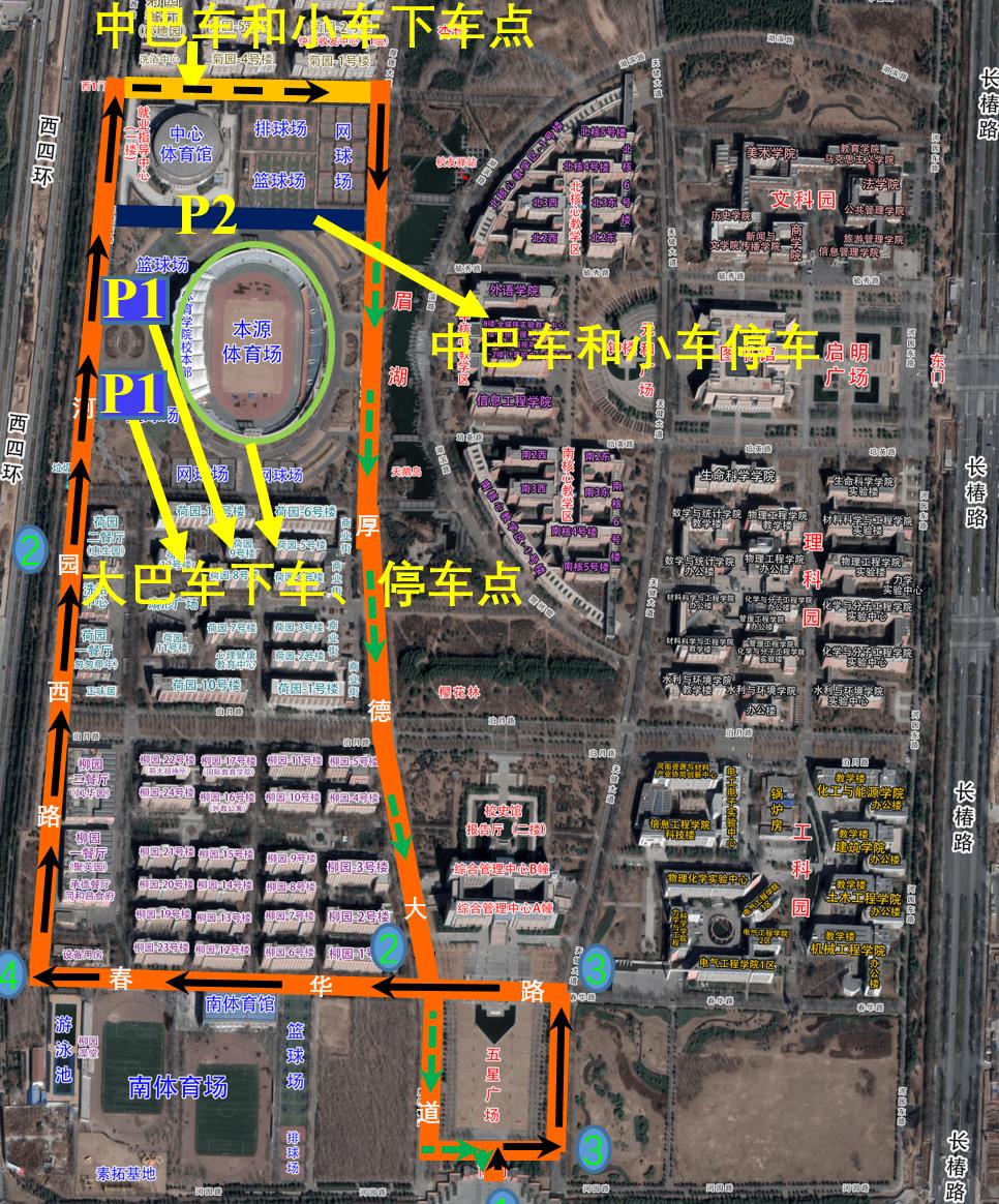 二、9月20日至22日校內交通管制區域和路段為:南門至天健大道,左轉到春華路,從河園西路到中心體育館西門、厚德大道,以及中心體育館和本源體育場附近所有停車區域等路段實行交通管制(具體內容和路線見附圖)。