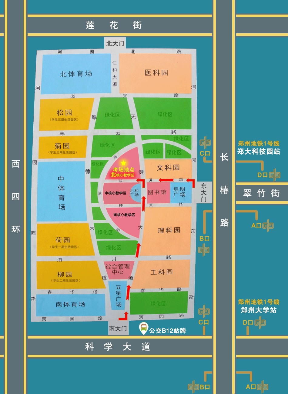 路線2:乘坐地鐵1號線到鄭州大學站下車,從C口出站,沿科學大道向西至鄭州大學南大門進入校園,右轉沿天健大道直行至毓秀路交叉口左轉,繼續直行向西即到北核心教學區。