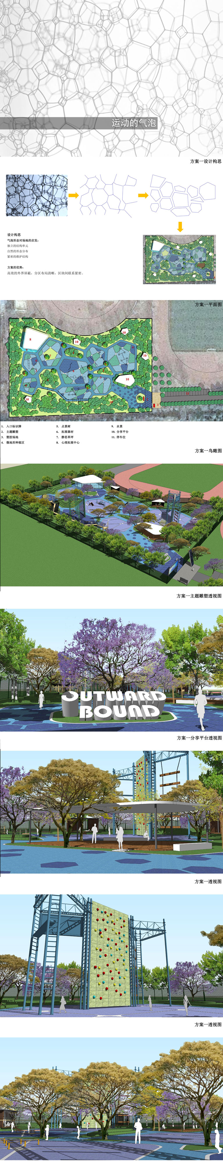 本方案的平面布局提取氣泡的形態,穩定的六邊形結構圍合出一個個拓展場地。每個氣泡單元(場地)相對獨立又互為聯系,功能分區清晰明了。此平面結構非常有利于后期的分區建設及實施。場地內的構筑物及小品均采用氣泡的外部形態,使整個場地渾然天成。