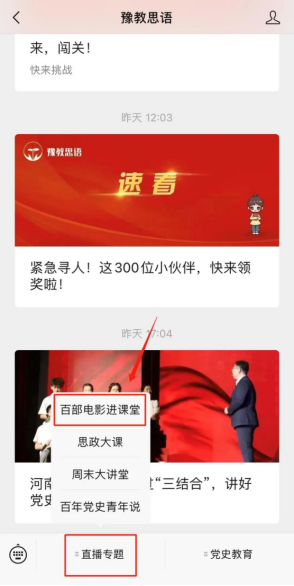 2.點(diǎn)擊左下方“直播專題”-“百部電影進(jìn)課堂”即可觀看直播